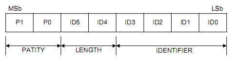 標識(ID-FIELD)定義了ID和數據的長度,其中的ID是由6個標識符IDENTIFIER位和兩個ID奇偶校驗位 ID PARITY bit表示,如圖5表示: