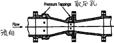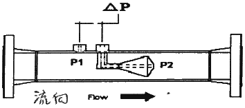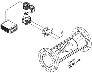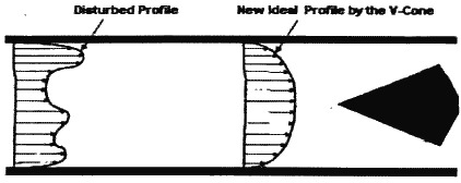 圖11(b)V形內錐的整流作用 由于VNZ流量計并不受速度分布的影響,因此可將這種VNZ流量計安裝在一個普通差壓式流量計無法適用的很短的直管上或很 小的安裝地點內.由于減少了上下游直管段及流動調整器,安裝空間及占地面積都大大減少,因此可以使原始投資大大削簡. 一個VNZ流量計的典型安裝圖如圖12所示.請注意VNZ流量計所要求的上游直管為0至3D,而其下游所要求的直管段為0至1D。