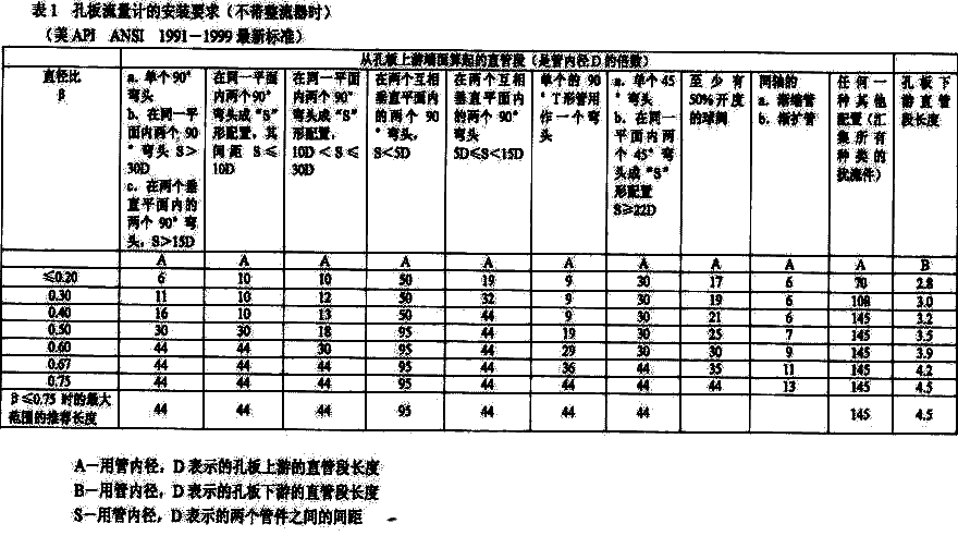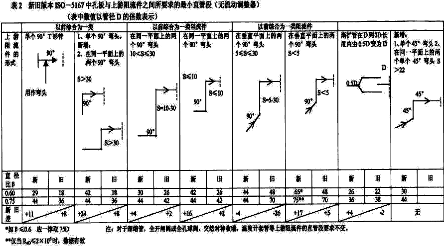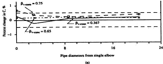 圖例:○—設計首選; ◎ —在一定條件下可用(向廠家咨詢); √—通常可用; ╳—不適用。 7.典型產品剖析: 7.1從速度分布,流動調整及直管段要求作橫向剖析. 為了獲得好的速度分布并且將旋轉二次流(渦流)從被測流體中消除,并且為了盡可能的縮短流量計上下游的直管段,大多數的流量計,如節流差壓式、超聲、渦輪或渦街流量計都要求在其上游安裝流動調整器。現根據最新公布的ISO標準(或標準草案)以及我國相應的國標分別對幾種主要流量進行剖析并與VNZ流量計作對比. 7.1.1傳統的節流差壓式流量計: ISO5167的修訂已有10多年的歷史,2003年3月國際標準化組織終于正式公布了新修訂的ISO5167新標準.這個ISO5167新標準所修改的主要內容有:[7.8] 7.1.1.1根據大量數據回歸的R/G公式取代了原來的Stolz公式;(參,見ISO5167-2:2003[E],5.3.2.1節,流出系數C); 7.1.1.2在沒有流動調整器的條件下,對孔板(或文丘利管)與一些上游阻流件之間所要求的最小直管段提出了全新的及更長的要求,詳見ISO5167-2:2003(E),表3,P.16以及本冊的表1、表2及表3。 7.1.1.3如在孔板上游安裝流動調整器,則可以適當縮短孔板上游直管段,詳見ISO5167-2:2003(E),表4,P.23; 7.1.1.4 采用新公式來計算孔板的可膨脹性系數(具體請參見ISO5167-2:2003(E),5.3.2-2節) 7.1.1.5修訂了關于孔板的不同軸度,不平面度及孔板上游管道粗糙度的限制要求。 與修訂前ISO-5167相比較,以上5條都是有實質性變化的內容,其中最主要的一條變化就是對孔板等節流裝置的上游最小直管段提出了全新的和加長的要求.現僅舉一個實例來說明ISO5167新舊標準的變化:如果將一個β值為0.6的孔板安裝在單個90°彎頭之后,那么按舊標準要求的上游最小直管段L1 =18D。新標準則要求L1=42D,新舊標準所要求最小直管段的差值△L1=+24D,現在ISO5167-2:2003(E)新標準已正式公布,原有的按老標準所設計選定的L1 ,由于太短(僅18D),該孔板流量計已不符合新標準的要求,在此種情況下唯一補救的辦法就是按新標準4的要求,在該β=0.6的孔板的上游13D處安裝一個19根管束的流動調整器,安裝工作包括切開線,焊接法蘭,裝入流動調整器,清洗,吹掃,打壓,耐壓測試與試漏等一系列的工作。如果孔板很多,很明顯工作量則相當巨大。 目前已研制出多種新型流動調整器,利用它們有助于在傳統節流 差壓式流量計入口處保持一個較好的速度分布,然而一般說來VNZ流量計則不需要任何流動調整器械.VNZ流量計本身能(修正)矯正已畸變的速度分布.這主要是由于流體與內錐的相互作用,測試結果證明:V形內錐有整流作用,它不但能改善速度分布還能在很大程度上消除旋渦二次流,詳見圖11(a)和圖11(b)[9] 畸變的速度分布 由內錐造成的新的速度分布