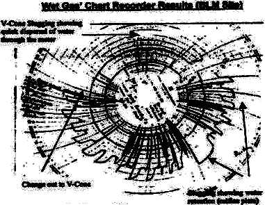 圖14(a)VNZ流量計信號 圖14(b)孔板的信號 7.3 從幾種流量計的購置費用進行剖析: 一般說超聲的購置費用最高,渦輪流量計的購置費其次,VNZ流量計最低而且它對不同被測介質的適應能力強,對不同工況條件的適應范圍也寬,雷諾數的適用范圍也更寬。其他如測量穩定性好,工作耐用可靠,要求直管段短,適宜測臟污流體更是它的突出優點。因此,VNZ流量計無疑地是一種物美價廉的優秀的流量計,它是取代孔板等差壓式流量計的最佳更新換代的產品。 8.利用VNZ流量計解決流量測量難題的典型用例分析 8.1濕氣體的流量測量難題 采用孔板測量濕氣體時,產生相當大的誤差,這是由于當氣體被水飽和時,差壓變送器的響應時間會造成計量誤差,再加上如孔板的上、下游存留著水時,會造成測量上的難題。當采用VNZ流量計取代了孔板后的結果是獲得了很小的不確定度。其測量結果的前后對比如圖15所示。在圖15的下半部份示出使用孔板測量濕氣體流量的記錄曲線。由于在孔板的上下滯留有水,于是當水積存多了就形成了“氣水相混”的團狀流動的條件。其結果是:使用孔板的計量站的不確定度變成超范圍的增大變寬。而當有氣水相混的團狀流動發生時,VNZ流量計則有很快的響應時間,無積水現象。而且VNZ節流裝置還能同時跟蹤靜壓力的變化。濕氣體流量測量記錄儀上的記錄曲線如圖15所示。該圖的上半部份表明當采用VNZ流量計取代孔板后,它能迅速排除積存的水并正常測量汽團狀流的情況,而該圖的下部是采用孔板時測量汽團狀流流量的記錄曲線。此圖直接取自土地管理局(BLM)計量站的圓圖記錄儀。 關于利用VNZ流量計測量濕氣體流量的最新報告詳見文獻[14]