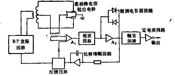 將電容量變化轉(zhuǎn)換成電信號的電路框圖見圖3—22所示.渦檢測傳感器由兩組金屬膜和電極板組成差動變化電容器,將它放在靜電容檢測電橋上,由RF振蕩回路產(chǎn)生激勵.當(dāng)渦產(chǎn)生時,靜電容量發(fā)生變化,導(dǎo)致電橋不平衡,將該不平衡勢通過RF放大電路放大,經(jīng)檢波后就得到與渦頻相對應(yīng)的信號.將該信號放大并整形成矩形波,由定電流回路作為給定電