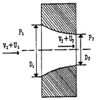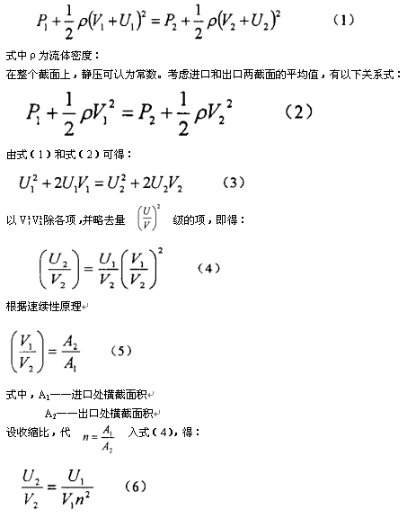 采用了變徑整流器后(見圖2),由于縮經斷面的流速在逐漸增大,在斷面上各點流速的增加是不一樣的,靠近中心流速增加小,而靠近喉徑邊沿處流速增加大。 設整流器進口處壓力為P1,平均流速為V1,某點上的速度不均勻度為U1,出口處壓力為P2,平均流速為V2,通過進口處某點同一流線,在出口處的速度不均勻度為U2,沿該流線,由伯努利方程得: |