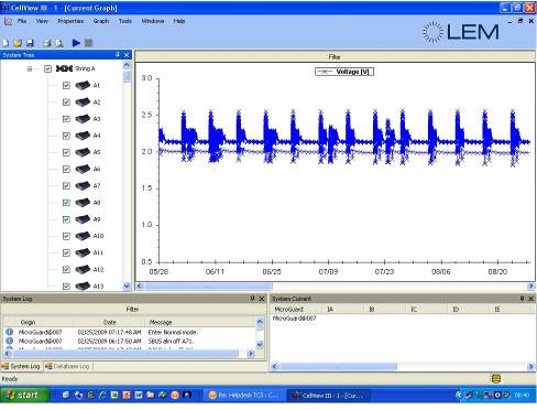 圖中明確地指出,一個電池單元提供的電壓為2V,而不是標稱的2.2V。雖然電池提供的電壓比預(yù)期的低,不過這種差別相對較小(在正常接受范圍內(nèi)),而且是穩(wěn)定的。這種特性很典型,采用輸出電壓作為電池即將失效的指標不再可靠,因為電壓值可以保持在閥值范圍內(nèi),因此不會觸發(fā)報警。這就是發(fā)生在這個例子中的;在收集這些數(shù)據(jù)時,監(jiān)測系統(tǒng)用于評估定期維護方案的有效性,而不是用于警告潛在的問題。由于沒有采取任何措施,該電池單元后來在圖2所覆蓋的時期內(nèi)嚴重失效;水平軸表示測試進行的日期。不過,在失效點(電池單元電壓下降至0.7V)以前,故障電池組的電壓從本質(zhì)上保持恒定,沒有任何即將失效的跡象。最后,維護人員在11月更換了該單體電池,隨后電壓恢復(fù)到整個電池陣列的平均值水平。