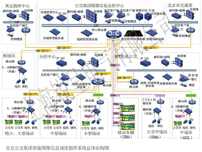 公交是城市運轉的第一道工序,與每個人的生活息息相關,與城市的發展一脈相承。隨著北京社會經濟的蓬勃發展,北京機動車輛和城市人口數量迅猛增長,目前北京在發展公共交通方面取得了一定成效,但隨著城市經濟社會發展以及人口和機動車快速增長,建設新北京交通體系,改善城市公共交通運輸結構,推進人文、綠色、高效的“公交城市”成為北京公交建設的重點。北京公交集團公司為了提高首都公共交通綜合管理水平,以運營、安全、服務為中心,堅持“方便出行,改善服務”的方針,不斷調整運營結構、車輛結構,合理規劃線網布局,開辟新線路。截止到2008年底,北京市擁有各類運營車輛28071輛,運營線路861條,年總行駛里程18.22億公里,總客運量45.81億人次,為全面實現“平安北京、和諧公交”戰略構想,構建社會主義和諧社會首善之區,滿足現代化交通調度指揮工作,全面提升公共交通管理與服務水平及提高預防和處置事故災難、公共安全等突發公共事件的能力,于是市政府決定建設北京公交集團智能圖像信息調度指揮系統以實現公交智能化、可視化的調度指揮。