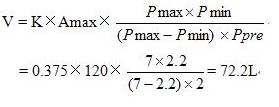 一恒壓供水設(shè)備水泵功率為4HP,水泵最大流量為120L/min,系統(tǒng)壓力低于2.2bar時水泵自動啟動,系統(tǒng)壓力達到7bar時,水泵自動停機,氣壓罐預充壓力為2bar,該系統(tǒng)要選用多大的氣壓罐?