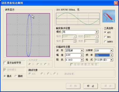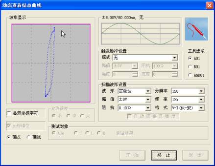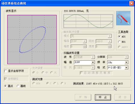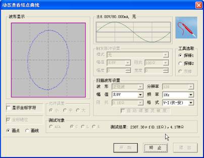 標稱為2700µF的容量還有2100多µF,但是漏電阻只有300多Ω,再看VI曲線是典型的電容并電阻的曲線特征,不用說是電容漏電了,容量也降了不少。因是第一次使用這個功能,心里沒底,要找一只好電容比較驗證一下。因手頭沒有2700µF電容,只好用一只2200µF電容進行比較了,用同樣的參數測試,結果顯示電容容量略大于標稱值,漏電阻大于4МΩ,VI曲線是典型的電容特征(見圖1-4),看來這個功能太有實用價值了。