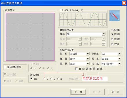 測試頻率選擇根據廠家的說明—100微法以下48HZ ,100微法以上選5HZ,當前選48HZ、然后將信號輸出表棒—探棒1接電容器的正極,接地表棒接電容器的負極,用鼠標點擊“開始”,被測電容器容量及漏電阻會提示在“測試結果”提示的右方,見圖2。注意:使用本測試方法在對有極性電容(如電解電容)測試時,要使探棒與有極性電容器正負極相對應,否則會影響漏電阻的測試精度。建議測試工具最好用廠家提供的三端測試鉤,中途不要中斷測試。