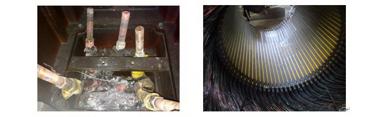 本文分析一臺VLT6500變頻器運行中顯示過電流故障分析。 上海津信變頻器技術服務中心接到客戶緊急維修電話,客戶反映是現場一臺VLT6500運行中過電流故障,并且電機內部有異味。 檢查過程: 然后根據客戶的反映情況,我們立即開始檢查該變頻器。先檢查變頻器的模塊,測試二極管特性良好。將控制卡拆下后可以把電源卡取下,依次拆下變頻器的驅動卡,電容箱,和IGBT模塊,整理模塊。對以上器件進行測試,性能良好。全部安裝好,靜態測試良好,變頻器送電,開機輸出電壓平衡。 電機檢查:將電機的接線盒打開后發現,電機的接線柱子已近完全燒壞。后將電機全部拆開發現內部繞組完全燒毀。見下圖:
