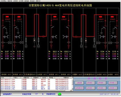 標(biāo)準(zhǔn)的變配電系統(tǒng)具有CAD一次單線圖顯示中、低壓配電網(wǎng)絡(luò)的接線情況;龐大的系統(tǒng)具有多畫面切換及畫面導(dǎo)航的功能;分散的配電系統(tǒng)具有空間地理平面的系統(tǒng)主畫面。主畫面可直觀顯示各回路的運(yùn)行狀態(tài),并具有回路帶電、非帶電及故障著色的功能。主要電參量直接顯示于人機(jī)交互界面并實(shí)時刷新。