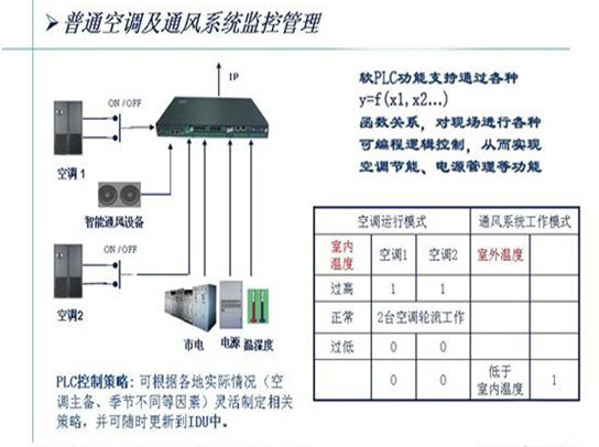 局站數(shù)量的龐大決定節(jié)能管理方案必須是系統(tǒng)自動完成,而不能靠監(jiān)控中心來根據(jù)局站的溫度去發(fā)遠(yuǎn)程控制命令來實(shí)現(xiàn)。這就需要采用脫離于“五遙”功能的PLC局站端自動控制功能。以下是充分利用機(jī)房動環(huán)監(jiān)控系統(tǒng)局站端采集器提供的PLC功能,實(shí)現(xiàn)小局站空調(diào)和通風(fēng)系統(tǒng)自動節(jié)能運(yùn)行的原理: