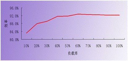 以下的曲線表明:整流模塊的負(fù)載率(模塊的輸出工作電流/模塊的額定電流)越高、其工作效率越高,能耗損失越小。