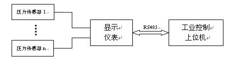 選用昆山雙橋傳感器測控技術有限公司生產的絕壓、表壓、差壓、微型、高溫、液位等高精度傳感器/變送器,配備高性能智能顯示儀表,即可組成小型壓力測量顯示系統。顯示的通道數根據用戶現場的測量要求可靈活增加或減少,并可通過開發的通訊軟件將所有通道的測量值顯示在用戶的控制上位機。系統框圖如下:
