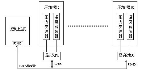 工程簡介: 溫度壓力測量系統選用高精度耐高溫壓力變送器和高精度溫度傳感器測量被測容器的溫度壓力值,每一只被測容器的溫度壓力值經過傳感器檢測后在現場的顯示儀表上顯示,并最終通過儀表的RS485接口將80只壓力容器的溫度壓力值集中到控制上位機上顯示。控制上位機軟件按照客戶的具體要求,可單幅或多幅同時顯示單個或多個被測容器的壓力溫度值,具有實時記錄存儲功能,并可根據用戶要求生成歷史報表和溫度曲線圖。