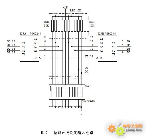 撥碼開(kāi)關(guān)提供用戶一個(gè)簡(jiǎn)化的人機(jī)接口,用于設(shè)定RS485通訊中的地址、波特率、數(shù)據(jù)格式等設(shè)定功能,撥碼開(kāi)關(guān)(SW1)的10位數(shù)據(jù)口都接10k電阻上拉到Vcc,電路使用一個(gè)74HC244(IC5)數(shù)據(jù)緩沖器,把撥碼開(kāi)關(guān)的狀態(tài)傳送到8位數(shù)據(jù)總線,剩余兩根數(shù)據(jù)線則直接接到CPU的I/O端口(見(jiàn)圖2)。