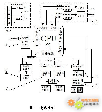 ARTU-J16遙控單元硬件主要包括主CPU芯片、撥碼開(kāi)關(guān)設(shè)定輸入、實(shí)時(shí)時(shí)鐘、雙路RS485通訊、SOE事件記錄存儲(chǔ)、看門(mén)狗控制、繼電器控制及輸出、供電電源模塊等8部分組成(見(jiàn)圖1)。