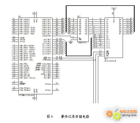 SOE事件記錄存儲(chǔ)器使用32k低功耗SRAM(IC3)IC61C256AH和后備電源形成一個(gè)斷電不丟失的數(shù)據(jù)存儲(chǔ)單元,使用數(shù)據(jù)鎖存器74HC373(IC2)和CPU的PC端口組成15位數(shù)據(jù)地址對(duì)IC3進(jìn)行數(shù)據(jù)存儲(chǔ)操作(見(jiàn)圖4)。