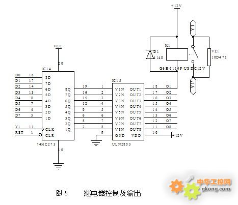 繼電器控制輸出使用一個(gè)74HC273(IC14)鎖存需要輸出的8路繼電器輸出狀態(tài),再經(jīng)由ULN2803(IC15)驅(qū)動(dòng)對(duì)應(yīng)的繼電器(K1只是16路中的一路),二極管D1可以旁路繼電器K1在斷開(kāi)的瞬間所產(chǎn)生的反向電流,而并接在K1輸出接點(diǎn)上的壓敏電阻VZ1則可以吸收關(guān)斷后級(jí)感性負(fù)載所產(chǎn)生的反向電動(dòng)勢(shì),有效延長(zhǎng)輸出繼電器觸點(diǎn)的壽命(見(jiàn)圖6)。