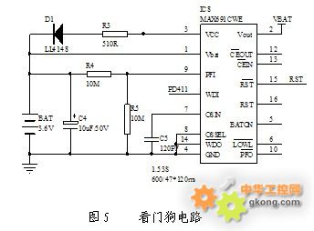 掉電自動(dòng)保存部分使用MAX691CWE(IC8)作為電源管理,在系統(tǒng)有輔助供電的情況下保證IC3由主電源Vcc供電,當(dāng)主電源掉電時(shí)則自動(dòng)切換到后備電池供電方式。同時(shí)此芯片還兼有看門(mén)狗功能,在系統(tǒng)死機(jī)的極端情況下及時(shí)復(fù)位CPU使系統(tǒng)快速恢復(fù)至受控狀態(tài)(見(jiàn)圖5)。