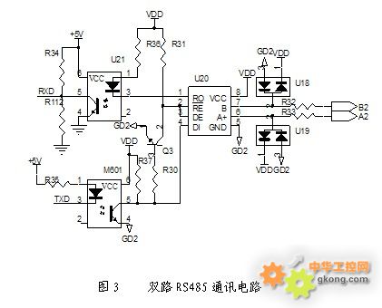 通訊方式采用雙路RS485方式,調(diào)試及設(shè)定和上位機(jī)通訊部分在物理上分成兩路,互不干擾,有效防止可能存在的誤操作(見(jiàn)圖3)。