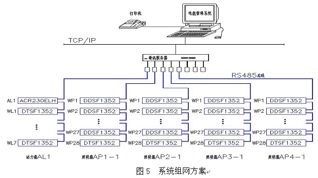 配電系統(tǒng)一次方案圖列出了總配電箱及宿舍一層照明箱配電箱的支路數(shù)及各支路電能表的型號。為滿足智能化監(jiān)測及遠(yuǎn)程自動(dòng)抄表需要,該電能管理系統(tǒng)采用RS485總線,將安裝于總配電箱AL1總進(jìn)線的1臺(tái)ACR230ELH多功能電力儀表、安裝于WL1~WL7及各樓層公共浴室的11臺(tái)DTSF1352三相導(dǎo)軌式電度表及安裝于宿舍樓各樓層的108臺(tái)DDSF1352單相導(dǎo)軌式電度表(27×4層宿舍樓)進(jìn)行集中組網(wǎng),監(jiān)控中心配置監(jiān)控計(jì)算機(jī)、打印機(jī)、通訊服務(wù)器及必要的輔助設(shè)備,安裝電能管理系統(tǒng)EMS軟件完成對各臺(tái)電能表的遠(yuǎn)程采集和數(shù)據(jù)的集