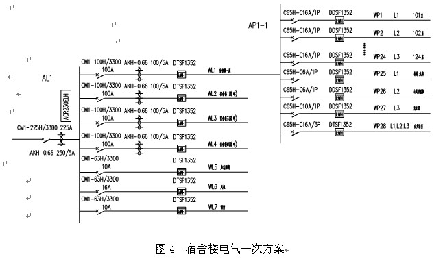 以某理工大學(xué)學(xué)生宿舍樓為例。該樓有4層,每層有24間宿舍,配有公共衛(wèi)生間、洗衣房、公共浴室,電氣一次方案見圖4。總配電箱進(jìn)線回路安裝有屏裝式ACR230ELH多功能電力儀表,計(jì)量宿舍總電量。包括三相有功電度、無功電度、功率、功率因數(shù)、電流、電壓、頻率以及分相電量等共34項(xiàng)電參量。電流、電壓2~31次分次諧波分量,電流、電壓不平衡度,電流、電壓正、負(fù)零序分量檢測和分析。每個(gè)樓層、應(yīng)急照明、風(fēng)機(jī)、預(yù)留電氣干線分別由7臺(tái)DTSF1352電表負(fù)責(zé)計(jì)量三相有功電度,電表可與CM1斷路器對應(yīng)并列導(dǎo)軌式安裝,也可集中安裝在箱內(nèi)上方。每一樓層的宿舍房間、公共衛(wèi)生間、洗衣房、走廊電能由27臺(tái)單相電表DDSF1352負(fù)責(zé)計(jì)量,公共浴室由1臺(tái)三相DTSF1352計(jì)量。