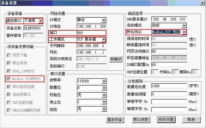 1.首先確認該設備是支持Modbus TCP的2040產品。使用ZLVircom軟件,搜索并找到該設備后,進行設備編輯。確認“該設備支持功能”中的Modbus TCP轉RTU左邊的勾已經選上,表示該設備支持Modbus TCP轉RTU。如圖2所示。