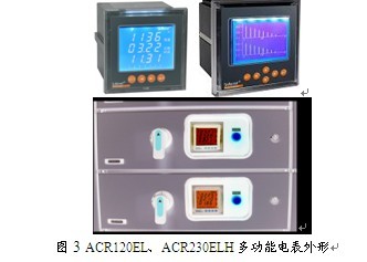 對于一些重要回路需檢測諧波含量的,可采用ACR230ELH多功能電表,滬建交[2008]828號文規定,在變壓器低壓側(AC230/400V)總進線處,應當設置多功能電能表,至少具有監測和計量三相電流、電壓、有功功率、功率因數、有功電能、最大需量、總諧波含量和2-21次各次諧波分量的功能。因此,采用ACR230ELH多功能電表,嵌入式安裝在配電柜門板上,面框尺寸為96mm×96mm,除測量所有電參量外,還具有最大需量,2-31次電流、電壓諧波分量、電壓波峰系數、電流K系數、電話波形因子、電流電壓不平衡度、正負零序分量分析等功能。ACR120EL,ACR230ELH多功能電表外形及其在低壓配電柜中的實際應用如圖3所示。