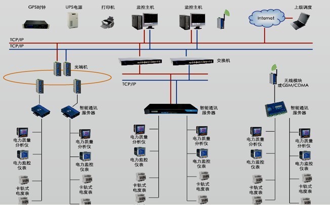 ACREL5000能耗分項計量系統可以根據現場情況,采用現場總線以光纖環網、以太網或無線等組網方式實現電能集抄與電能計量功能。系統以計算機、通訊設備、現場電力儀表計量裝置為基本工具,為實時數據采集、遠程管理與控制提供了基礎平臺。該系統主要采用分層分布式計算機網絡結構,分站控管理層、網絡通訊層和現場設備層(如圖5)。