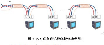 儀表之間采用屏蔽雙絞線進行總線型連接,圖4所示為ACR120EL儀表通訊電纜接線示意圖。通過對配電系統的現場電力儀表進行組網,經由通訊網絡到達監控主機,將分散的儀表連接為一個有機的整體。