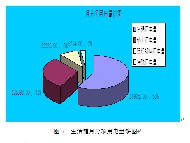監控室電能管理系統通過現場設備和通信系統提供的傳輸通道,完成對各用電回路的數據采集,信息經分析、處理,以報表、圖形等多種形式供值班員參考,使值班員能夠便捷的掌握系統的運行及電能使用狀況,及時發現、糾正用電浪費現象,從而節約用電。在需要時,還可提供快捷的遠程控制手段,完成對設備運行狀態的改變以及事故情況的處理。圖6給出了生活館電能計量查詢表,很清楚的顯示出各分項用電的使用情況。圖7是系統給出的生活館照明、空調及插座等分項用電量的餅圖,很直觀地顯示出分項用電量的百分比。