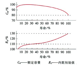 大量的實驗數據表明,老化蓄電池的內阻和放電能力之間存在著一定的關系,內阻的劇升同電池容量的減少有關(圖2),尤其是在蓄電池壽命未到80%的時候更為明顯。用內阻測試來考核蓄電池的狀況是一種相當可靠的方法。  圖2蓄電池容量、內阻與壽命的關系