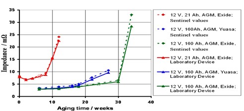 通過與美國AACHEN大學試驗室設備作比對測試,兩種測試設備得到了非常接近的測試數據(圖4),從測試數據看,LEM Sentinel蓄電池內阻測量結果準確、可靠,可以真實地反映出蓄電池的健康狀況。  圖4:LEM Sentinel 與AACHEN實驗設備測試數據