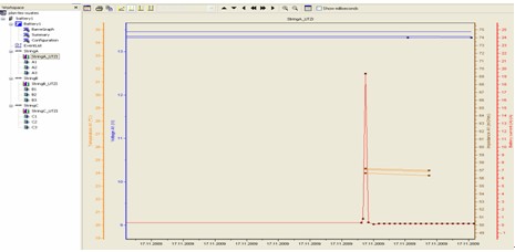 7)模塊采用脈沖電流放電法測量內阻,放電電流小,不但安全且對蓄電池不易造成傷害,模塊可以檢測單個電池的溫度,這是目前市場上的其他同類產品所罕見的。  圖5:柱狀圖顯示網絡中各個電池的電壓、溫度、內阻  圖6:連續記錄電池的電壓、溫度、內阻、電流