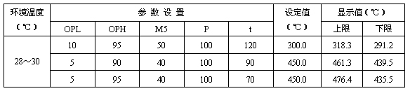 用鉑電阻溫度變送器作輸入,輸出信號給固態繼電器,驅動加熱電爐。加熱電爐保溫差、散熱較快,當環境溫度變化較大時,影響控制精度;因為電爐功率有限,滯后時間較長,使整定時間長、效果差。根據環境溫度,適當調整參數OPL、OPH值。進行手動自整定,自整定結束后,適當減小M5,增大t,這樣可以得到較為滿意的效果。參數設置見表3,實驗數據見表4。 |