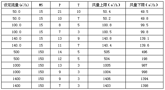 使用的一體化智能孔板流量計能對孔板的工作狀態進行運算,使其測量的不確定度小于±1.5%F.S。 選用風機時,考慮到流量范圍的覆蓋情況,使其能在調節頻率的狀態下,滿足風量的要求。 以“三墾力達”變頻器為例,調整變頻器參數,使其在6~65Hz范圍內,適應AI儀表輸入的要求,滿足風機電機特性的需求。 AI儀表在上述閉環控制中,用手動自整定可的滿意結果。參數設置見表7,實驗數據見表8。