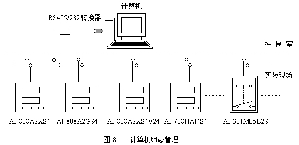 1.組態軟件概述 組態軟件是一種基于計算機操作系統的軟件平臺,經過了嚴格的測試,可靠性高,更換驅動程序和板卡,可以和不同廠家的儀表和PLC組成DCS系統。選用組態軟件時首要問題是軟硬件的匹配,其次是確保所選軟件能完成自己所需要的功能。在我們的系統中選用的是AI系列儀表,故采用與之匹配的宇電專用版組態王軟件來開發集控工作站的圖形界面和數據庫。 組態王(宇電專用版)軟件使用的RS-485接口通訊協議是宇電自主開發的AI-BUS協議,數據格式為一個起始位,八位數據,無校驗位,一個或兩個停止位。通訊傳輸數據的波特率可調為1200~19200 bit/S(波特率為19200時需配高速光耦的通訊模塊)。 2.AI-301ME5型開關量模塊的使用 開關量模塊上的D0~D9狀態對應10H參數的低10位,當對某一位置“1”時該觸點閉合,置“0”時斷開,上位機對開關量模塊“寫” 狀態時使用BitSet(Var , bitNo, OnOff )函數,“讀”狀態時使用Bit(Var , bitNo)函數。 3.組態與管理 根據要求,組態結果能對現場的溫度、濕度、流量、風量進行監測和控制,并對工藝數據進行儲存和曲線記錄以及報表打印,并能通過上位機對儀表和設備啟停。根據以上要求,我們在AI系列儀表上安裝上S4通訊模塊,設置不同的儀表ID地址,并把波特率設置為9600bit/S,在上位機的軟件開發平臺上,新建多個設備名稱,每個設備的波特率和數據格式都要確認滿足AI-BUS通訊的要求,并且每一個設備的地址要和下位機儀表的地址相對應。計算機組態管理如圖8所示。 在數據詞典里建立變量表,變量可分為內部變量和外部變量,根據要求我們建立了多個測量值變量(PV)、設定值變量(SV)、輸出值變量(MV)以及相應的手自動轉換變量(CTRL)與PID參數變量(M5、P、T)、開關量模塊的整型變量。以上變量均為外部變量,另外為了完成動畫和其他設計的要求,例如“報表”等等,還需要建立一些內部變量作為中間變量使用。 歷史數據庫的設計,為了能夠完成對歷史數據的記錄和打印要求需要建立歷史數據庫,在一般系統中,組態王自帶的歷史數據庫就能滿足要求,我們的系統中就是利用了組態王自帶的數據庫。實際運行效果良好,如果對記錄還有更高要求,那可以通過使用DDE數據交換功能,也使用SQLSERVER來做數據庫。 圖形界面是工業控制軟件中的重要內容,通常包括總貌顯示,工藝流程圖畫面顯示,分組畫面顯示,實時/歷史趨勢圖顯示,過程控制實時數據顯示/歷史數據顯示以及報警等。組態王具備上述的所有功能,一般情況下用戶可以使用組態王提供的圖形庫和自定義圖形來組態工藝流程圖等畫面,同時可動態顯示工藝參數。另外也可使用AutoCAD和CorelDRAW軟件生成對象,用組態王激活圖形對象,使之反映出過程的動態變化。在我們的系統中包含有工藝流程圖畫面,分組畫面控制顯示,實時/歷史趨勢圖顯示,過程控制實時數據報表顯示/歷史數據報表顯示。 實踐證明,組態王方便于設計人員開發組態軟件,同時也便于操作人員使用組態軟件,與國內同行業軟件相比,具有一定的領先性。