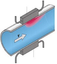 超聲波流量測量主要有兩種方法:多普勒法,即利用介質反射聲波使頻率發生改變,聲源和接收聲波的介質相對運動時產生頻差。運行時間法,即聲速疊加介質流速,若超聲波與水流方向一致,則運行時間短,反之運行時間就長,流速可由運行時間差運算得來。