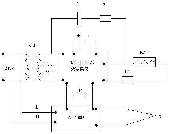 電路說明:交流電源經變壓器降壓后使用,輸出電壓25V,輸出電流28A、MJYD-JL-75為晶閘管智能模塊,內含晶閘管和移相控制電路,輸出最大電壓450V,最大電流75A,L1為過流保護熔斷器,RC為過壓保護阻容元件。RW為電爐絲。 A1-708P輸出為0-10MA電流,經過1K電阻后,輸出變為0-10V直流電壓,滿足晶閘管模塊的輸入電壓要求。 S熱電偶通過補償導線和A1-708P儀表后端連接。 |