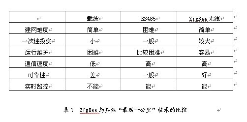 由于ZigBee的優(yōu)越特性,基于ZigBee技術(shù)的無(wú)線組網(wǎng)是一種比較合適的下行信道的實(shí)現(xiàn)手段。適合應(yīng)用于一些短距離的無(wú)線網(wǎng)絡(luò)的組網(wǎng),例如寫(xiě)字樓、辦公樓、宿舍樓、工廠等無(wú)線抄表網(wǎng)絡(luò),適用于企業(yè)內(nèi)部能耗監(jiān)測(cè)及管理系統(tǒng),尤其適用于一些布線困難舊樓改造的能耗管理系統(tǒng)中。而若將其與成熟的工業(yè)以太網(wǎng)和GPRS/CDMA上行信道結(jié)合,與后臺(tái)管理主站組成一個(gè)完整的集抄和監(jiān)控系統(tǒng),則可以為遠(yuǎn)程管理提供一個(gè)有效的解決方案。ZigBee與其他最后一公里通訊技術(shù)比較見(jiàn)表1。