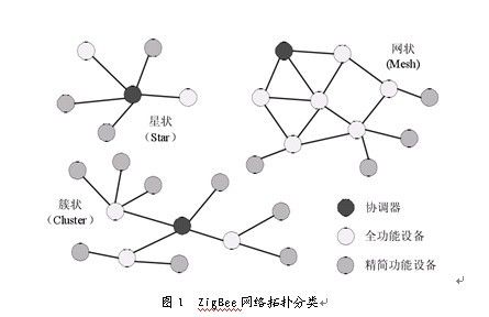 ZigBee協(xié)議基于IEEE 802.15.4標(biāo)準(zhǔn),從2004年發(fā)布ZigBee V1.0到最新的增加了ZigBee-PRO擴(kuò)展指令集的ZigBee2006版本,ZIGBEE功能不斷強(qiáng)大。ZigBee具備強(qiáng)大的設(shè)備聯(lián)網(wǎng)功能(見(jiàn)圖1),它支持3種主要的自組織無(wú)線網(wǎng)絡(luò)類(lèi)型,即星型結(jié)構(gòu)(Star)、網(wǎng)狀結(jié)構(gòu)(Mesh)和樹(shù)型結(jié)構(gòu)(Cluster Tree),特別是網(wǎng)狀結(jié)構(gòu),具有很強(qiáng)的網(wǎng)絡(luò)健壯性和系統(tǒng)可靠性。與目前普遍應(yīng)用的wi-Fi、Bluetooth等短距離無(wú)線通訊技術(shù)相比較,ZigBee的特點(diǎn)主要有: