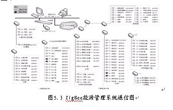 該項(xiàng)目整個(gè)ZigBee能源管理系統(tǒng)采用的無(wú)線模塊為21個(gè),包括各類(lèi)表記82個(gè)塊。圖5.3為ZigBee能源管理系統(tǒng)中的通信圖,它列出了整個(gè)系統(tǒng)包含的所有表計(jì)。其中配電室的14個(gè)表通過(guò)485總線連接到一個(gè)ZigBee采集模塊進(jìn)行無(wú)線通信,各個(gè)空調(diào)插座由于比較分散,各采用一個(gè)ZigBee采集模塊,等等。具體視表計(jì)的離散情況,集中在一起的用485總線連接一個(gè)模塊,分散的分別連接一個(gè)模塊。以這樣的方式比較靈活,減少布線帶來(lái)的困難。