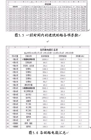 圖5.5為一段時(shí)間內(nèi)的進(jìn)線回路各項(xiàng)參數(shù)的具體數(shù)值,它詳細(xì)地記錄了進(jìn)線回路三相電壓、電流、有功電能、無(wú)功能電能、功率因素、頻率參數(shù)。整個(gè)廠區(qū)各回路電能匯總?cè)鐖D5.6所示,它記錄了一段時(shí)間內(nèi)各個(gè)回路的耗電情況,包括各回路進(jìn)行柜的總電能及分支電能。