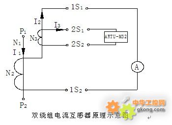 1-端子1S1;2-端子2S1;3-端子1S2;4-端子1S2;5-副繞組;6-主繞組 2.2工作原理 雙繞組電流互感器的工作原理同電流互感器的工作原理,基本工作原理如圖1(b)、圖2(b)、圖3所示,雙繞組電流互感器一次電流I1由主繞組(6)P1端流進,至P2,主繞組(6)一次繞組匝數為N1,主繞組(6)二次電流I2由端子1S1(1)流出,經過電流表至端子1S2(3),副繞組(5)二次繞組匝數為N2,副繞組(5)輸出端2S1(2)和2S2(4)輸出AC0-20mA小電流信號,供給測控裝置采集。所以有: I1×N1+I2×N2=I0×N1(1) I2×N2+I3×N3=I0′×N2(2) 由(1)式可得: I2×N2=I0×N1-I1×N1 由(2)式可得: I2×N2=I0′×N2-I3×N3, 所以可得: I0×N1-I1×N1=I0′×N2-I3×N3, 即 I0×N1+I3×N3=I0×N1+I0′×N2 上述式中I0為主繞組(6)的勵磁電流,I0′為副繞組(5)的勵磁電流。所以主繞組(6)的輸出誤差,可以通過增加鐵芯截面或提高鐵芯性能或通過誤差補償的方法來調節誤差,而副繞組(5)的誤差的補償是通過共同提高兩個繞組的性能來實現;雙繞組電流互感器的電動勢也類似于電流互感器原理,這里不作詳細介紹。