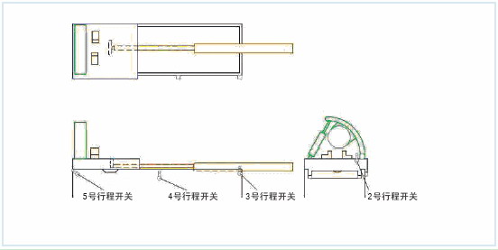 切割過程中和切割完成后平臺和鋼管依然保持運動,直到平臺觸碰3號行程開關,加緊機構松開,平臺不在和鋼管一起運動而停止,經過一段時間的延時后(一般2-3分鐘)圖中橙色部分動作推動平臺返回,再回程過程中會觸碰4號行程開關,翻料機構(不在這臺機床上)動作,切下的管子離開切管機。平臺回程后會觸碰5號行程開關,等待下一段鋼管達到要求的長度。