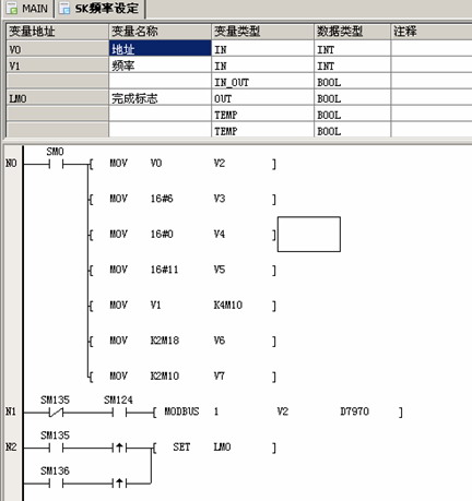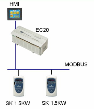 SK系列變頻器頻率通過MODBUS總線的通訊方式給定,PLC利用輸出端子控制SK系列變頻器的啟動和停止。