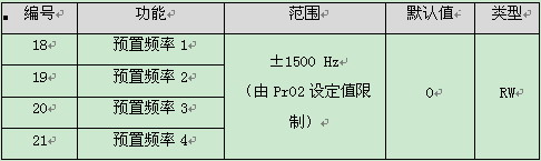18號參數為預制頻率1,PLC可以通過更改PR18的值來修改變頻器頻率。PR18對應寄存器地址(協議級)=18-1=17,PLC通過通訊修改協議地址17的值改變變頻器頻率。