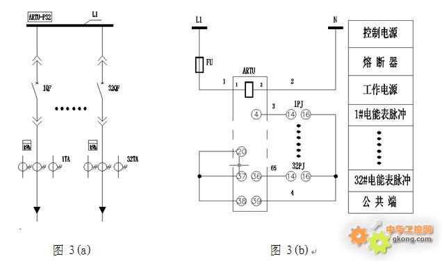 以計量32個饋線電能為例,電能表采用DTM862-2型,一次方案見圖3(a),電能脈沖采集二次見圖3(b)。使用傳統的機械式電能表附帶脈沖接口,利用智能化的脈沖接收裝置實現遠程集中式抄表功能。