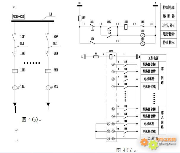 1臺ARTU-K32可以監控8條馬達回路或16路照明回路的工作狀態。以監測馬達回路為例,一次方案見圖4(a),由配輔助、故障觸點的NS斷路器、LC1交流接觸器、LR2熱繼電器和AKH-0.66P保護型互感器組成。每條馬達回路監測4組節點,即斷路器合閘、故障觸點,電機運行(接觸器)狀態觸點,電機熱過載(熱繼電器)觸點,1臺ARTU-K32監測8條馬達回路。見圖4(b),通過現場啟停按鈕控制馬達的運行與停車,現場紅、綠指示燈同步顯示馬達的工作狀態,遙信單元則可通過監測各元件觸點的動作值遠程顯示馬達的工作狀態。