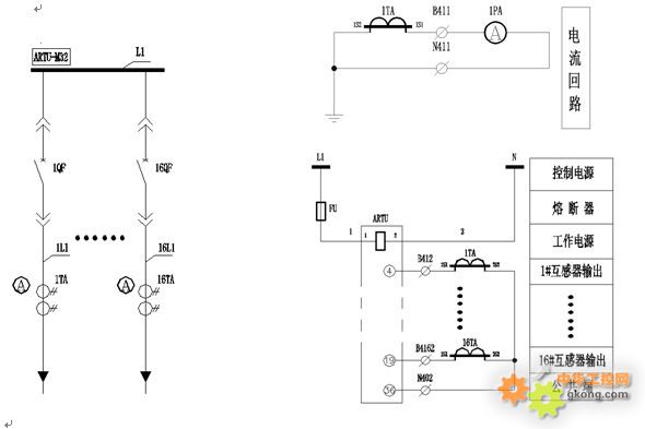 以檢測16路饋線的工作電流為例,一次方案見圖2(a),電流互感器采用AKH-0.66S低壓雙繞組互感器,用于電流采集,一次側額定電流5A-6300A,二次輸出有2個繞組,一組輸出0-5A(或1A),給99T1、6L等指針表作當地顯示電流值,另一組輸出交流0-20mA,給ARTU-M32單元遠傳遙測,見圖2(b),電流測量回路通過指針表顯示各饋線回路相應的電流值,遙測回路利用通訊端口遠程集中顯示各回路電流值。