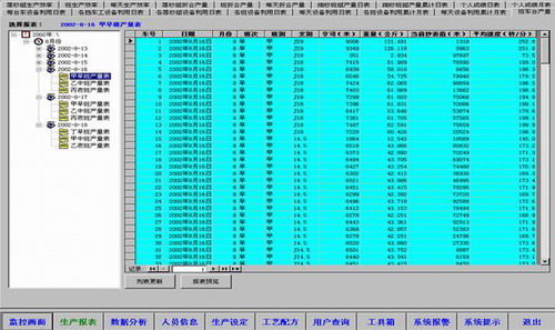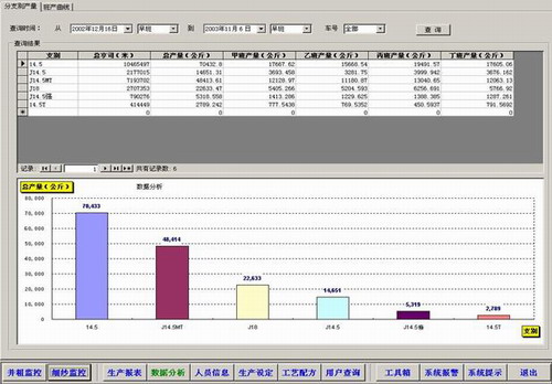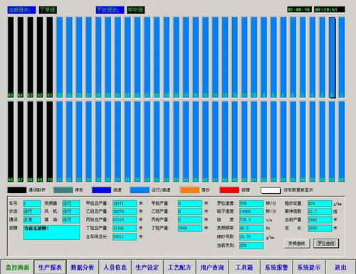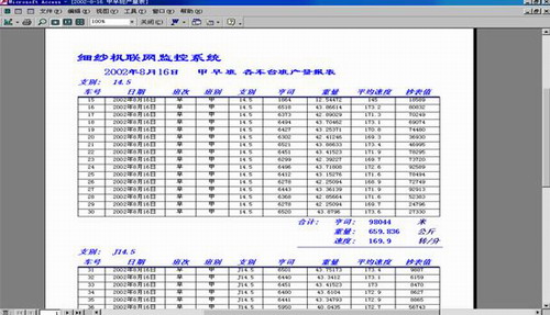 變頻曲線如下圖: 對應的前羅拉轉速曲線: 2.生產報表部分生產報表主要執行報表統計、歷史報表顯示、報表打印功能。報表種類有:設備利用:各班每臺車的設備利用報表、各班每個擋車工的設備利用報表、每天各班每個落紗組的設備利用報表、每天設備利用報表、各班設備利用累計月報表、每天設備利用累計月報表。產量分析:各班各車臺產量報表,各班每個落紗組各支別的折合單產、生產效率月報表,各班各支別的折合單產、生產效率月報表,每天各支別的折合單產、生產效率月報表,各班各落紗組的生產量、折合產量月報表、各班的生產量、折合產量月報表、每天的生產量、折合產量月報表、每天各班的細紗班組產量日報表、每天各班的細紗班組產量月報表,每天各班各擋車工個人成績日報表,每天各班各落紗工成績日報表、每天各班各擋車工個人成績月報表、每天各班各落紗工個人成績月報表。生產報表如下圖所示 報表預覽如下圖所示: 報表統計如下圖: 查看每個班各車臺的休止記錄: